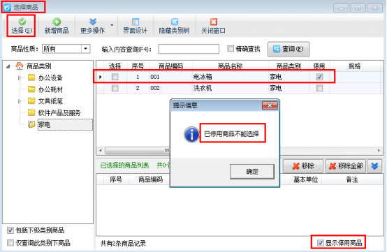 ????“選擇商品”窗口也可以顯示已停用的商品信息,勾選“顯示停用商品”,然后點擊“查詢”按鈕就會顯示出來已停用的商品。如果開單選擇已停用的商品,系統會提示“已停用商品不能選擇”,如圖3所示。