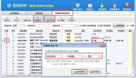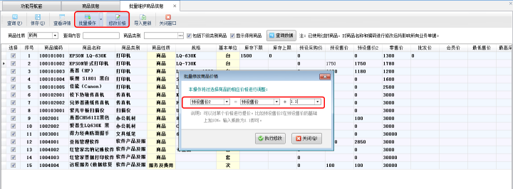 ????在批量維護商品信息界面,修改價格需要在批量模式下進行操作。點擊“批量操作”按鈕進入批量操作模式,可以勾選部分商品或者全選商品進行修改,本次勾選商品“EPSON LQ-630K、EPSON針式打印機、惠普(HP)LaserJet 1020”為例,勾選后點擊修改價格,彈出“批量修改價格”界面,修改此商品的預設售價=預設售價*1.1,如下圖所示: