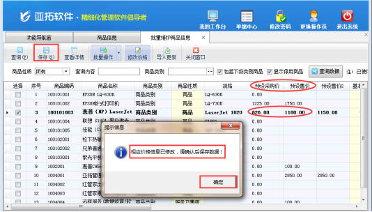 ????設置好價格調整計算公式后,點擊執行修改,會提示是否確認修改,點擊確定后會執行修改操作,可以看到商品“EPSON LQ-630K、EPSON針式打印機、惠普(HP)LaserJet 1020”預設售價的價格在原來的基礎上提價10%,修改后點擊工具欄的“保存”按鈕,商品的價格會保存當前修改結果。如下圖所示:
