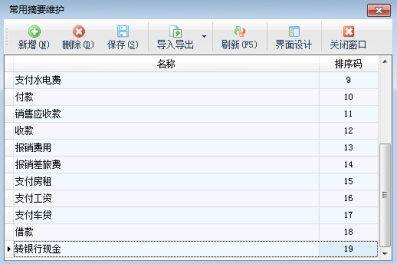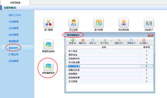 ????在功能導航窗點擊“基礎資料”—》“費用項目維護”即可打開“費用項目維護”窗口,如下圖所示,在“費用項目維護”窗口即可進行新增、修改、刪除常用費用項目等操作。