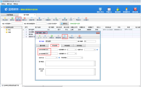 ????進入批量維護客戶信息界面后,在應收信用額度處可輸入金額,然后保存設置,如下圖所示: