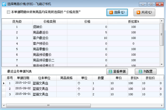 ????導入價格后,點擊保存,價格優先級設置按“客戶最近價”優先顯示,開單選擇此客戶后選擇商品獲取到的價格是導入的客戶最近價。
