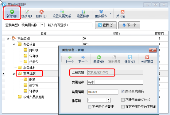 ????在功能導航窗點擊“基礎資料”—》“商品信息”可以打開商品信息管理界面,在工具欄點擊“商品類別”按鈕可以打開“商品類別維護”窗口,在“商品類別維護”窗口可以進行新增、修改、刪除、設置從屬關系、導入導出商品類別等操作。如下圖所示: