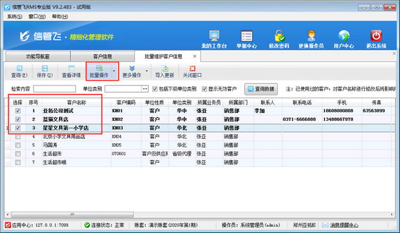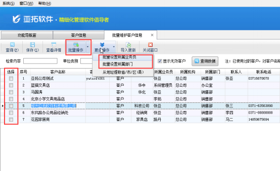 ????進入批量維護客戶信息界面后,點擊“批量操作”進入批量操作模式,打鉤選擇要批量設置所屬業務員的客戶信息。