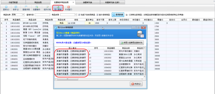 ????導入更新選擇Excel文件,選擇后,下一步點擊“自動對應”匹配下數據列,對應完成點擊“開始導入”按鈕,導入完成會提示導入成功,導入結果會顯示“數據內容重復,已更新相應數據項”,關閉導入界面。可查看到預設售價信息已導入成功,保存當前界面,如下圖所示: