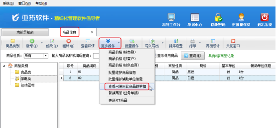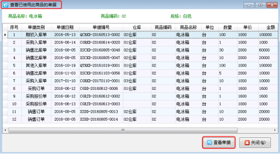 ????在功能導航窗選擇“基礎資料”—》“商品信息”進入商品信息界面,對于重復的已開單商品點擊刪除按鈕后仍存在此商品,刪除不了,可選擇此商品,點擊工具欄“更多操作”下的“查看已使用此商品的單據”,可查看到已開單記錄,如下圖所示: