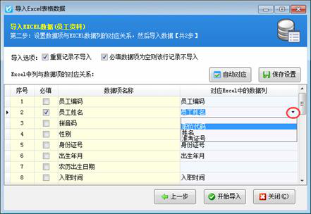 ????3、配置數據項與Excel中數據列的對應關系:點“下一步”按鈕配置“數據項”與Excel中的數據列之間的對應關系。點“自動對應”軟件會自動根據數據項名稱和數據列列名是否相同進行自動匹配。也可以按照下圖5所示手工選擇對應關系。