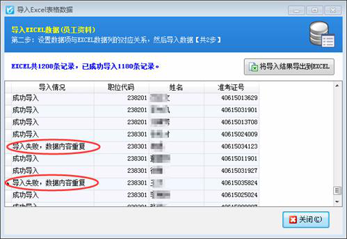 ????導入過程中軟件會實時顯示導入進度,如果數據量比較大時,導入進度達到100%時軟件進行數據提交會比較耗時。導入結束后,軟件會顯示導入的結果。沒有導入的記錄軟件會給出相應的原因,如下圖6所示。