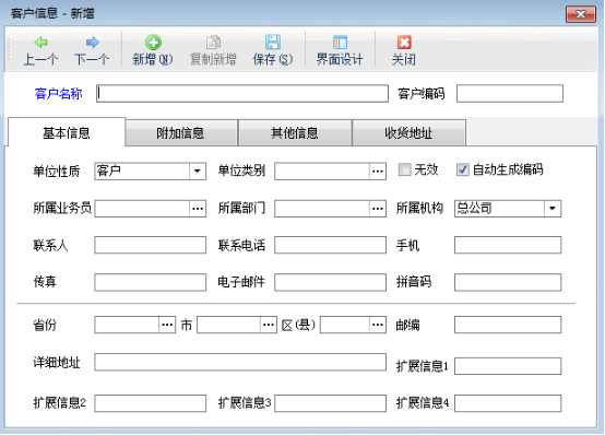 ????客戶名稱:必填項,默認客戶名稱不允許重復(可在“系統參數設置”功能的業務參數中設置為允許“往來單位名稱重復”)。