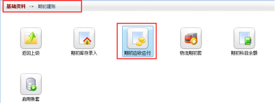 ????在功能導航窗,點“基礎資料”—》“期初建賬”—》“期初應收應付”,即可進入“期初應收應付”界面,如下圖所示: