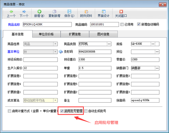 ????信管飛RMS(進銷存管理軟件)專業版支持批號管理功能,可以對商品進行分批次出入庫,如下圖所示,在編輯商品信息界面勾選“啟用批號管理”,即可啟用此商品批號管理功能。
