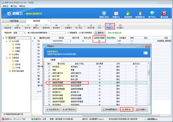 ????首先,在商品信息界面工具欄中點擊“界面設計”打開界面設計界面,將“啟用批號管理”列配置顯示出來,如下圖所示。