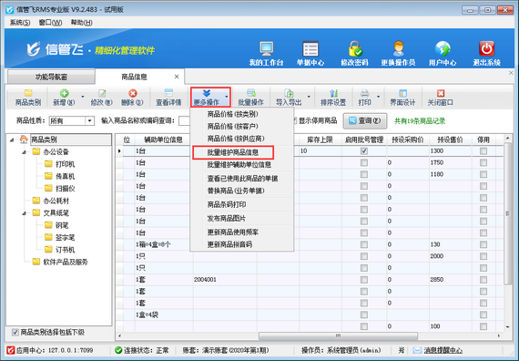 ????在功能導航窗點擊“基礎資料”—》“商品信息”即可進入“商品信息”界面,然后點擊“更多操作”—》“批量維護商品信息”進入“批量維護商品信息”界面,如下圖所示: