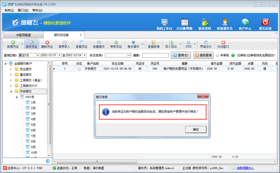 ????部分試用出納記賬軟件的用戶,在修改日記賬憑證時,會提示“當前憑證為賬戶期初余額自動生成,請在資金賬戶管理中進行修改”,憑證無法直接修改,如下圖所示。