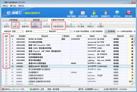 ????進入批量維護商品信息界面后,點擊“批量操作”進入批量操作模式,打鉤選擇要批量設置商品類別的商品信息,然后點擊“設置商品類別”即可批量設置所選商品的商品類別,設置后點擊“保存”按鈕保存設置即可。
