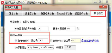 ????首先啟用電腦應(yīng)用中心中的移動APP服務(wù),在應(yīng)用中心程序中選擇:系統(tǒng)參數(shù)—》其他參數(shù),勾選“啟用APP服務(wù)”,如下圖所示: