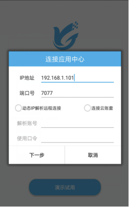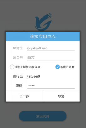 ????此連接需要購買動態(tài)IP解析服務(wù),在電腦端應(yīng)用中心啟用動態(tài)IP解析服務(wù)后,手機APP登錄界面點擊選擇賬套,勾選上啟用動態(tài)IP解析,輸入解析賬號和使用口令,點擊“下一步”選擇賬套登錄,如下圖所示: