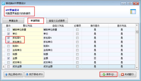 ????需要手機APP明細項顯示出“折扣率和折扣單價”該如何設(shè)置?手機APP的界面調(diào)整需要在電腦端界面設(shè)計“移動端界面設(shè)計”中進行調(diào)整,如下圖,打開電腦端軟件,銷售出庫單的界面設(shè)計,選擇“移動端界面設(shè)計”,勾選顯示出“折扣率和折扣單價”。
