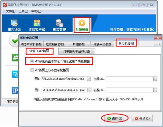 ????打開應(yīng)用中心窗口,點“系統(tǒng)參數(shù)”—》“首頁輪播圖”—》“信管飛APP首頁”,勾選“APP登錄頁面不顯示“演示試用”功能按鈕”,然后保存設(shè)置。如下圖所示:
