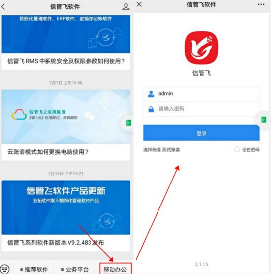 ????關(guān)注公眾號后,在微信界面可找到“信管飛軟件”,建議置頂(聊天窗口長按此項后點擊置頂公眾號)或者設(shè)置浮窗(登錄界面右上角點擊“...”,彈出界面點擊浮窗),方便后期直接打開,打開公眾號界面,點擊右下角“移動辦公”可彈出軟件登錄界面。如下圖所示: