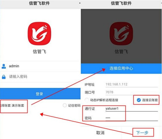 ????云賬套服務(wù)數(shù)據(jù)存在我們云服務(wù)器上,通過購買分配的通行證賬號和密碼來連接獲取云端的數(shù)據(jù),直接手機APP點擊選擇賬套,勾選上“連接云賬套”,輸入通行證賬號和密碼,點擊下一步選擇賬套進行登錄,如下圖所示: