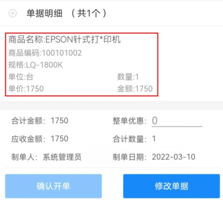 ????電腦端界面設(shè)計設(shè)置完成后,登錄手機APP,重新打開單據(jù),可看到單據(jù)明細上已顯示“折扣率和折扣單價”,如下圖所示: