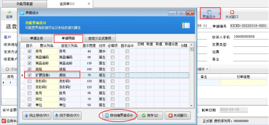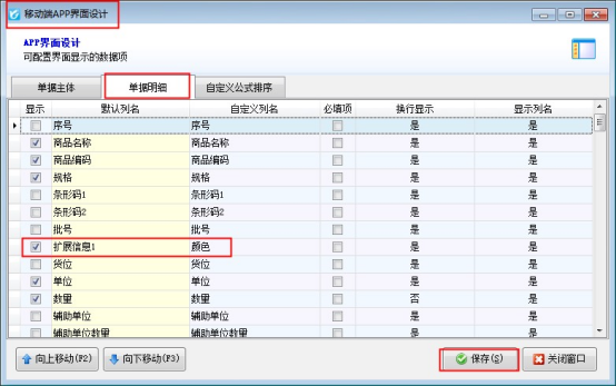 ????微信端界面設(shè)計需要在電腦端的開單界面界面設(shè)計中“移動端界面設(shè)計”中配置。打開電腦端軟件界面設(shè)計,選擇移動端界面設(shè)計,進入APP設(shè)計界面,勾選單據(jù)明細“擴展信息1”可向上移動到規(guī)格數(shù)據(jù)項后邊,然后保存配置,如下圖所示: