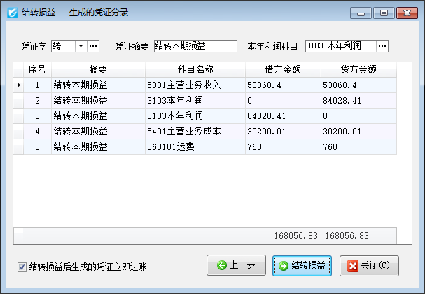????點(diǎn)擊“下一步”按鈕,軟件會自動(dòng)生成相應(yīng)的憑證分錄,點(diǎn)“結(jié)轉(zhuǎn)損益”按鈕即可結(jié)轉(zhuǎn)余額到“本年利潤”科目。可以打勾選擇“結(jié)轉(zhuǎn)損益后生成的憑證立即過賬”復(fù)選框,則相應(yīng)的憑證會自動(dòng)審核過帳。