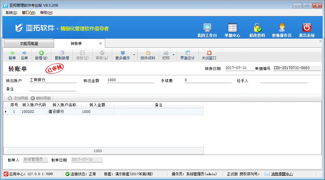 ????點(diǎn)亞拓管理軟件專業(yè)版內(nèi)包含有財(cái)務(wù)處理模塊,其中轉(zhuǎn)賬單主要用于實(shí)現(xiàn)不同資金賬戶之間的資金劃撥,轉(zhuǎn)賬單不影響總的資產(chǎn)總額(有轉(zhuǎn)賬手續(xù)費(fèi)的除外),本篇文章我們來介紹一下轉(zhuǎn)賬單的使用方法。