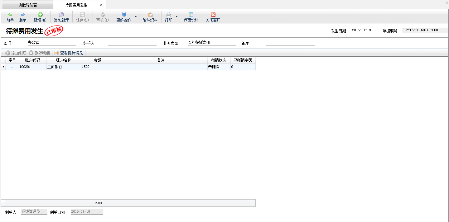 ????點(diǎn)擊“財(cái)務(wù)處理”—》“待攤費(fèi)用”—》“待攤費(fèi)用發(fā)生”,在“待攤費(fèi)用發(fā)生”功能中,錄入付款賬戶和付款金額,如果需要按部門核算也可以選擇相應(yīng)的部門。