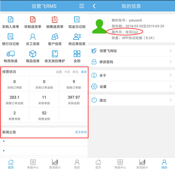 信管飛RMS支持手機APP登錄進行業務開單、庫存查詢等操作,另外在APP首頁也可以查看經營狀況及資金狀況,如下圖所示。如果需要設置操作員賬號登錄不可在APP首頁查看資金狀況,如何設置呢?下面詳細介紹一下操作過程。 在功能導航窗點擊“系統管理”—》“操作員及授權”,進入“操作員管理及授權”界面,選擇操作員賬號,然后在“其他操作權限”界面將“APP首頁顯示資金狀況”權限勾選取消,然后保存權限設置,如下圖所示,設置操作員“張亞”APP首頁不可顯示資金狀況。 設置完成后,使用操作員賬號“張亞”