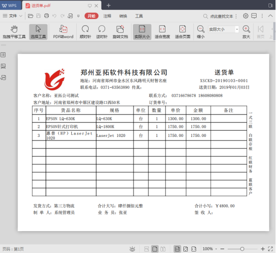信管飛送貨單軟件、信管飛RMS、信管飛倉庫管理軟件等都支持打印送貨單(銷售單),軟件支持把送貨單預覽界面導出到Excel文件、Html文件、Text文件及jpg、pdf等電子檔格式,方便用戶導出送貨單的電子檔給客戶看,方便客戶可以隨時查看送貨單內容。下面我們以信管飛送貨單軟件為例講一下如何把送貨單預覽界面導出為pdf格式。 打開一個已經開好的送貨單,點擊“打印”—》“打印預覽”,可以打開送貨單打印預覽界面,如圖1、圖2所示。圖1圖2 在打印預覽界面,點擊“保存報表”按鈕,可以選擇需要需