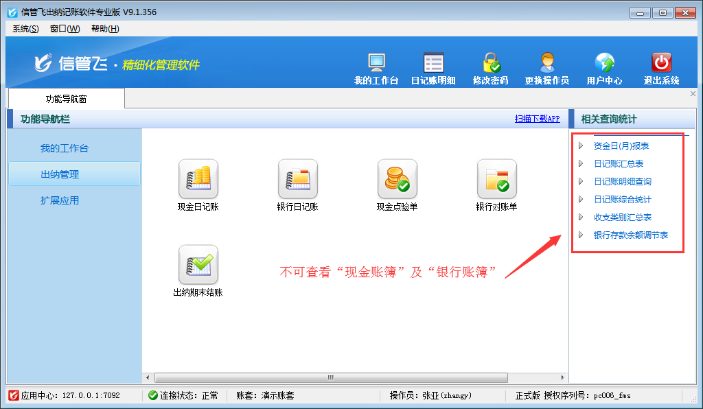 信管飛出納記賬軟件內包含豐富的記賬統計表格,如現金賬簿、銀行賬簿、資金日(月)報表、收支類別匯總表等。如果不希望員工賬號登錄后查看到這些報表,如何設置呢?本篇文章以信管飛出納記賬軟件專業版為例演示一下出納記賬軟件內如何設置操作員不可查看現金及銀行賬簿。 登錄軟件,在功能導航窗點擊“系統管理”—》“操作員及授權”,進入“操作員管理及授權”界面,選擇操作員“張亞”,在其右側的功能模塊權限內選擇“出納查詢”模塊,將現金賬簿和銀行賬簿的“使用”權限勾選取消,然后保存設置,如下圖所示。 操作員權