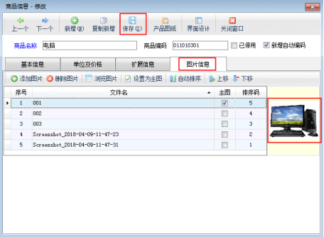 亞拓管理軟件(標準版與專業版)和信管飛倉庫管理軟件都可以對商品信息進行管理,都支持上傳商品圖片,以便用戶查看商品圖片信息。本篇文章以亞拓管理軟件專業版為例介紹一下如何上傳商品圖片。 在功能導航窗點“基礎資料”—》“商品信息”即可進入“商品信息”界面,對商品進行新增或修改時可以編輯商品信息、上傳商品圖片信息。以商品“電腦”為例,對商品進行修改,系統彈出“商品信息修改”窗口,點擊“圖片信息”頁面,如圖1所示。圖1 添加圖片:點擊“添加圖片”按鈕,可以選擇已準備好的圖片,支持jpg、png等