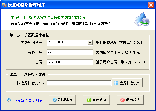 本程序可以在您重新安裝操作系統后,恢復帳套數據庫,支持新陽天進銷存系統、好好用財務出納記賬系統、好好用日記賬系統等全系列系統。如果您的機器無法啟動,有沒有備份的帳套數據文件(后綴名為.pmd)或者很久沒有備份過,可以通過本工具將帳套數據文件(后綴名為.mdf)直接恢復。此程序為最新版本 2001.05.26下載地址: http://www.hzyouth.org.cn/download/DBTools.exe程序界面: