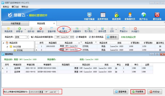 “替換商品(業務單據)”顧名思義指可以把業務單據中的該商品批量替換為另外一個商品。軟件中替換商品功能一般作用于以下兩種情況:①開單選擇錯商品,可直接在商品信息中替換為正確的商品;②存在已開單重復的商品無法刪除。本文以第二種情況進行示范。 信管飛送貨單軟件、信管飛RMS軟件都支持維護商品信息,軟件默認刪除商品信息只能刪除未使用開單的商品,存在商品已開單并重復,需要刪除重復的商品可使用商品信息更多操作下的“替換商品”進行先替換再刪除操作。本文以“信管飛送貨單軟件”為例進行示范此功能如何使用。
