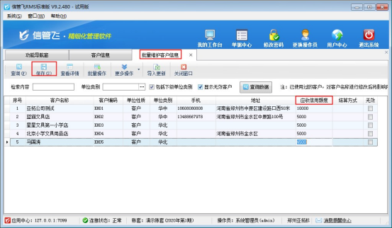 信管飛RMS軟件、信管飛送貨單軟件等支持管理應收款,有客戶存在已收貨未付款情況,對此種情況的客戶,可設置一個應收信用額度,在客戶的應收信用額度內可先收貨后付款。軟件支持批量添加客戶的信用額度,不需要在客戶信息中逐個打開進行修改。 本文以“信管飛RMS標準版”進行示范,如何批量維護客戶的信用額度。 在功能導航窗點擊“基礎資料”—》“客戶信息”,在客戶信息界面工具欄點擊“更多操作”下的“批量維護客戶信息”,如下圖所示: