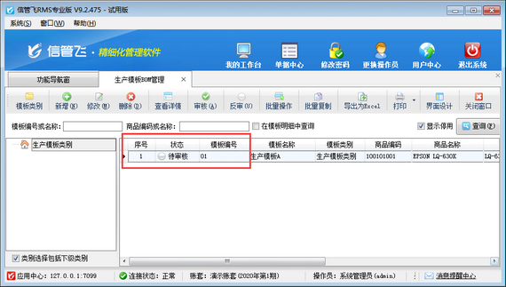 生產模板,即BOM清單(物料清單),可配置每生產一個標準單位的產品需要的原材料種類和數量。生產模板已審核后,不允許直接修改或者刪除,如下圖所示。如生產模板數據維護有誤,需要先將已審核的生產模板反審至待審核的狀態,然后在修改(刪除)生產模板即可。 在生產模板BOM管理界面,選擇一個已審核的生產模板,在工具欄中點擊“反審”按鈕,系統彈出提示信息“您確定要反審當前選擇的生產模板?”,然后點擊“是”按鈕對已審核的生產模板進行反審操作,如下圖所示。 反審核成功后,生產模板狀態更新為“待審核”狀態