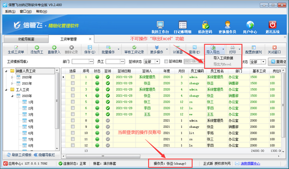信管飛出納記賬軟件專業版包括工資管理功能,支持自定義工資模板管理員工工資單,可根據設置的工資模板快速生成工資單,支持從上月工資單復制工資項目數據。為了避免操作員導出工資單,軟件中可以設置操作員不可導出工資記錄權限。下邊我們在軟件中示范下設置操作員不可導出工資記錄權限的操作步驟。 登錄軟件,在功能導航窗點擊“系統管理”—》“操作員及授權”,進入“操作員管理及授權”界面,選擇操作員“張亞”,在其右側的功能模塊權限內選擇“綜合管理”模塊,將工資單管理的“導出”權限取消勾選,然后保存設置,如下圖所示。 &n