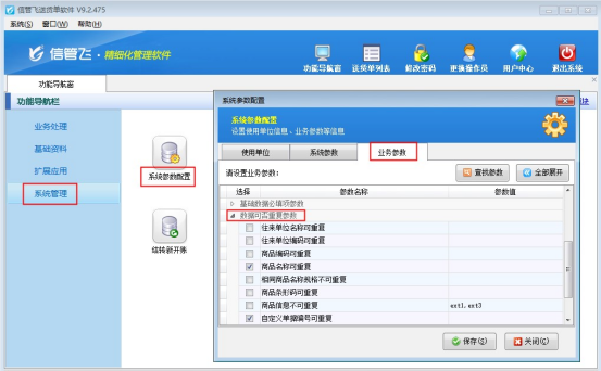 信管飛軟件系列產品都支持靈活針對使用情況,對軟件進行參數配置,對于基礎信息的操作,可設置是否重復參數,進行管理商品、客戶信息。本文針對“業務參數”中的數據可重復參數,介紹下如何使用。 在功能導航窗點擊“系統管理”—》“系統參數配置”點擊“業務參數”,啟用全部折疊,找到“數據可重復參數”,可以看到可重復參數包含以下參數,如下圖所示: 1.往來單位名稱可重復:默認不勾選,勾選后基礎資料—“客戶信息”可重復。