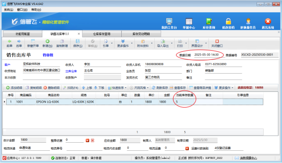 用戶在使用進銷存軟件過程中,遇到在銷售出庫單界面點擊刷新庫存按鈕,當前庫存數(shù)量未更新為該商品的當前實際庫存數(shù)量,是什么原因呢,該如何解決?     例如商品名稱“EPSON LQ-630K”,倉庫庫存數(shù)量是5個,出庫單開單界面點擊刷新庫存當前庫存數(shù)量是0,經(jīng)檢查發(fā)現(xiàn)原因是該商品入庫單發(fā)生時間是5月30日14點22分,銷售單出庫時間是5月30日10點,如圖      解決方法:將銷售出庫單時間修改為入庫時間之后,比如5月30日14點30分,再點擊刷新庫存,即