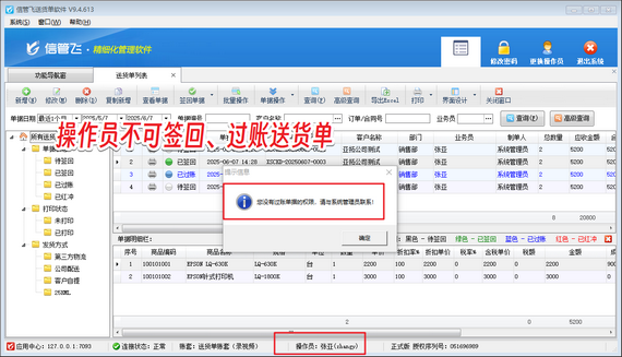 在商貿(mào)流通領(lǐng)域,送貨單作為貨物交接的核心憑證,其簽收與回執(zhí)流程直接影響企業(yè)資金流轉(zhuǎn)效率與風險管控能力。信管飛送貨單軟件以智能化流程管理為核心,通過“待簽回-已簽回-已結(jié)賬”三階狀態(tài)控制,實現(xiàn)貨物交付全鏈路可視化追蹤,更以精細化權(quán)限管理功能,為企業(yè)筑牢運營安全防線。    針對多角色協(xié)作場景,信管飛送貨單軟件創(chuàng)新推出操作權(quán)限分級機制。企業(yè)可根據(jù)崗位職責靈活配置權(quán)限,例如禁止基層操作員執(zhí)行簽回、過賬等核心操作,從源頭規(guī)避人為失誤或違規(guī)風險。這一設(shè)計既保障了財務數(shù)據(jù)的嚴謹性,又賦予一線員工高效處理業(yè)務的自主權(quán),實現(xiàn)效率與安全的平衡。