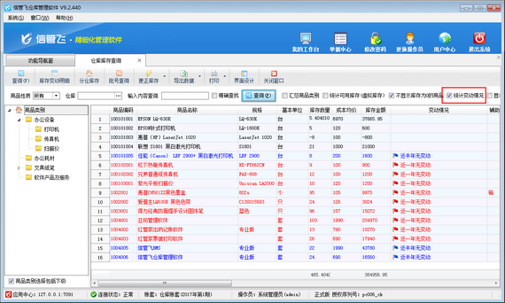 信管飛RMS、信管飛倉庫管理軟件可以對商品庫存進行統計,也支持統計商品近期的出庫情況,可以統計近半年、近一年無出庫的商品,方便對商品出庫情況進行管理。本篇文章以倉庫管理軟件為例介紹下倉庫管理軟件中如何統計近期無出庫的商品。    在功能導航窗中點擊“倉庫管理”—》“倉庫庫存查詢”,即可進入倉庫庫存查詢界面,勾選“統計變動情況”,再點擊“查詢”按鈕,可查詢近半年、近一年無出庫的商品記錄。如下圖所示:    其中,近半年無出庫的商品記錄以藍色顯示,近一年無出庫的商品記錄以紅色顯示。 &nbs