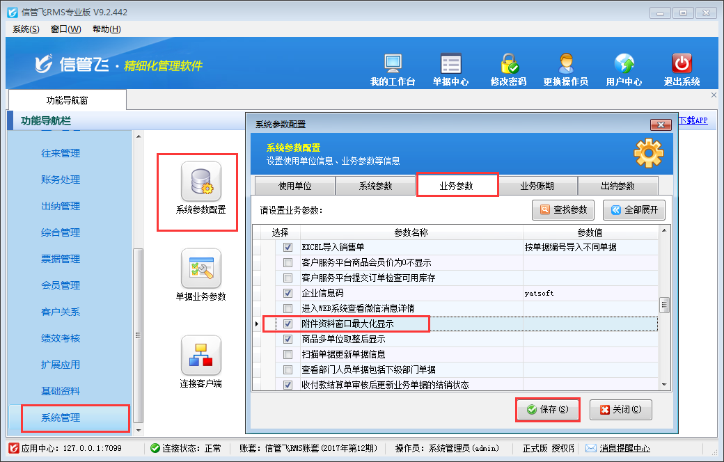 信管飛RMS(進銷存管理軟件)新增或者修改業務單據時,支持添加文檔、圖表等附件資料,可掃描或導入與業務單據相關的電子文件,方便用戶更全面、直接地查詢業務單據的全過程,有利于企業對業務單據的管理(如下圖所示),附加資料窗口默認顯示模式支持大窗口和小窗口兩種顯示模式,本文介紹一下如何設置附件資料窗口默認顯示模式?    在功能導航窗點擊“系統管理”—》“系統參數配置”—》“業務參數”打開業務參數配置界面,然后在特殊功能參數中可以找到“附件資料最大化顯示”參數,如下圖所示。     “附件資料最大化顯示