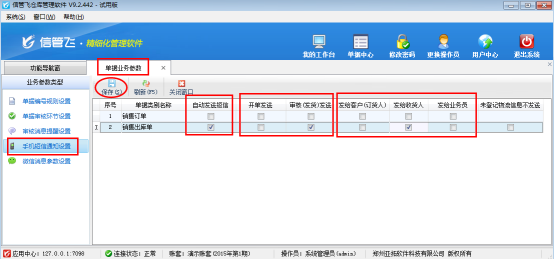 信管飛倉庫管理軟件集成了手機短信發送服務,可以發送開單通知、發貨通知、生日祝福等業務短信。軟件中可以設置短信模板,系統會自動調取單據中的內容,無需我們手動輸入繁瑣的內容,可以節約我們寶貴的時間和精力。軟件也支持自定義發送短信。統一采用1065全國全網正規通道,速度更快,更能提升企業形象,軟件只能發送發貨通知等業務短信,嚴禁群發營銷短信。    手機短信管理屬于增值業務,具體開通方式可聯系客服進行咨詢。以信管飛倉庫管理軟件為例,來介紹下如何對設置開單自動發送短信。    登錄軟件,在功能導航窗點擊“