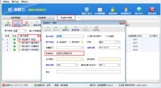 出納記賬軟件下載安裝完成后,使用演示賬套中的資金賬戶登記現金日記賬,在現金日記賬界面,點擊“查看賬簿”,可進入現金賬簿界面,如下圖1所示,可看到核算單位顯示:亞拓辦公用品公司,如果需要修改為自己公司信息,該如何修改?本文以“信管飛出納記賬軟件”為例,示范如何修改現金賬簿中的核算單位。 圖1     現金賬簿中的核算單位默認是調用資金賬戶提前維護好的核算單位信息,因此需要修改此內容,需要到資金賬戶中找到當前現金賬戶進行修改,在功能導航窗選擇“基礎資料”—》“資金賬戶”,找到現金賬戶“現金1”,點擊