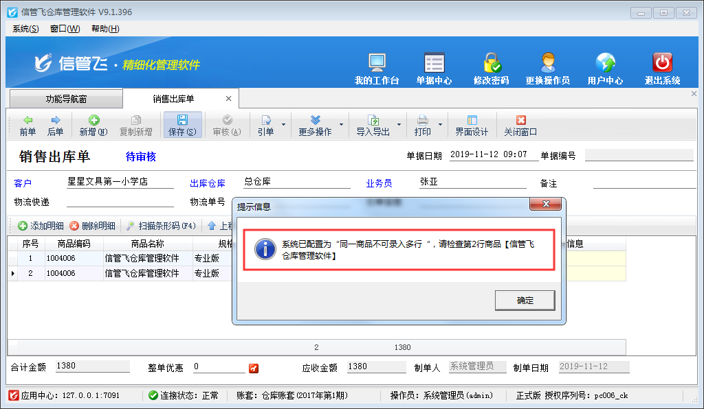 信管飛送貨單軟件、信管飛倉庫管理軟件、信管飛RMS等軟件在新開業務單據時默認在單據明細內支持同一商品可添加多條記錄(如下圖所示),部分用戶在開單時需要設置在單據明細中同一商品不可錄入多行?該如何設置呢?本篇文章我們以信管飛倉庫管理軟件為例來介紹一下如何設置開單時單據明細中同一商品不可錄入多行。 在功能導航窗點擊“系統管理”—》“系統參數配置”—》“業務參數”,即可進入到“業務參數”配置界面,在業務單據明細參數內找到“在單據明細中同一商品可錄入多行”參數,把這個參數的勾選去掉,然后保存,如下圖所示。