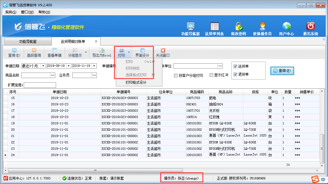 信管飛送貨單軟件為集訂單管理、送貨管理、收款結算等功能并支持送貨明細對賬及業務綜合對賬的送貨單打印軟件。軟件根據錄入的每張訂單及送貨單等數據,可以自動生成統計報表,完成企業銷售統計查詢和與客戶對賬的目的,如下圖所示。如果不希望員工賬號登錄后打印送貨明細對賬單,如何設置呢?本篇文章介紹一下具體操作步驟。 登錄軟件,在功能導航窗點擊“系統管理”—》“操作員及授權”,進入“操作員管理及授權”界面,選擇操作員“張亞”,在其右側的功能模塊權限內選擇“統計查詢”模塊,將送貨明細對賬單的“打印”權限勾選取消,然后保存設置,如下圖所示: