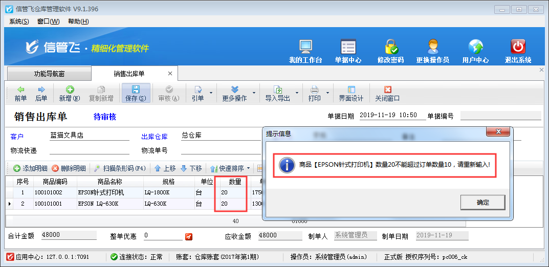 銷售出庫單開單時軟件支持引用銷售訂單進行發貨出庫,保存并審核銷售出庫單后,軟件會自動更新相應銷售訂單的執行狀態及訂單單據明細中每個商品的完成數量。其中銷售出庫數量是否可以超過訂單數量,可以在軟件中進行設置。下面我們以信管飛倉庫管理軟件為例介紹一下在軟件中如何設置“銷售數量不可超過訂單數量”? 在功能導航窗點擊“系統管理”—》“系統參數配置”—》“業務參數”,即可進入到“業務參數”界面,勾選“銷售數量不可超過訂單數量”參數,然后點擊“保存”按鈕保存配置,如下圖所示。 設置完之后,在功能導