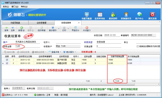 信管飛送貨單軟件、信管飛RMS軟件等支持錄入客戶的預付款,客戶預付款是指客戶付定金給我們,在實際發貨后會收回應收款,此時軟件收款結算中支持客戶應收款可以抵消之前客戶的預付款。本文以“信管飛送貨單軟件”為例,示范下應收款如何抵消客戶預付款? 首先需要新增客戶的預付款,有以下兩種方式: ①客戶下訂單時付定金,可直接在開訂單時輸入預收定金。②直接在應收款管理界面新增客戶預付款。 本文以方式①為例,首先新開訂單,在訂單界面,選擇客戶和商品明細后,在預收定金中
